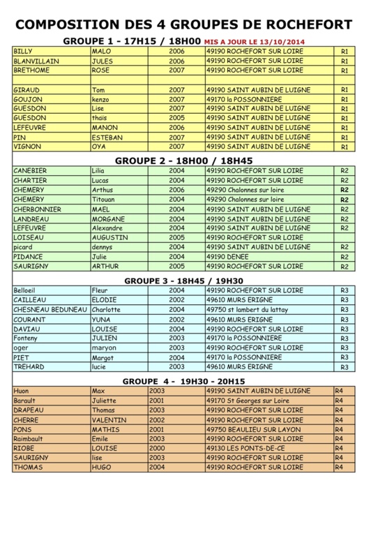 Voici la composition mise à jour au 13/10/2014 des 4 groupes de Rochefort.