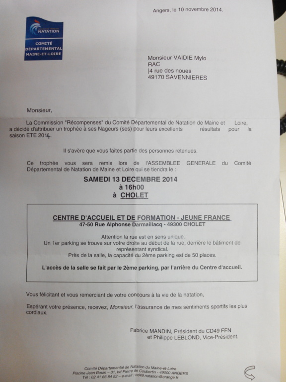 Mylo Vaidie sera récompensé lors de l’assemblée générale du comité départemental de natation grâce à ses performances de l’été 2014.